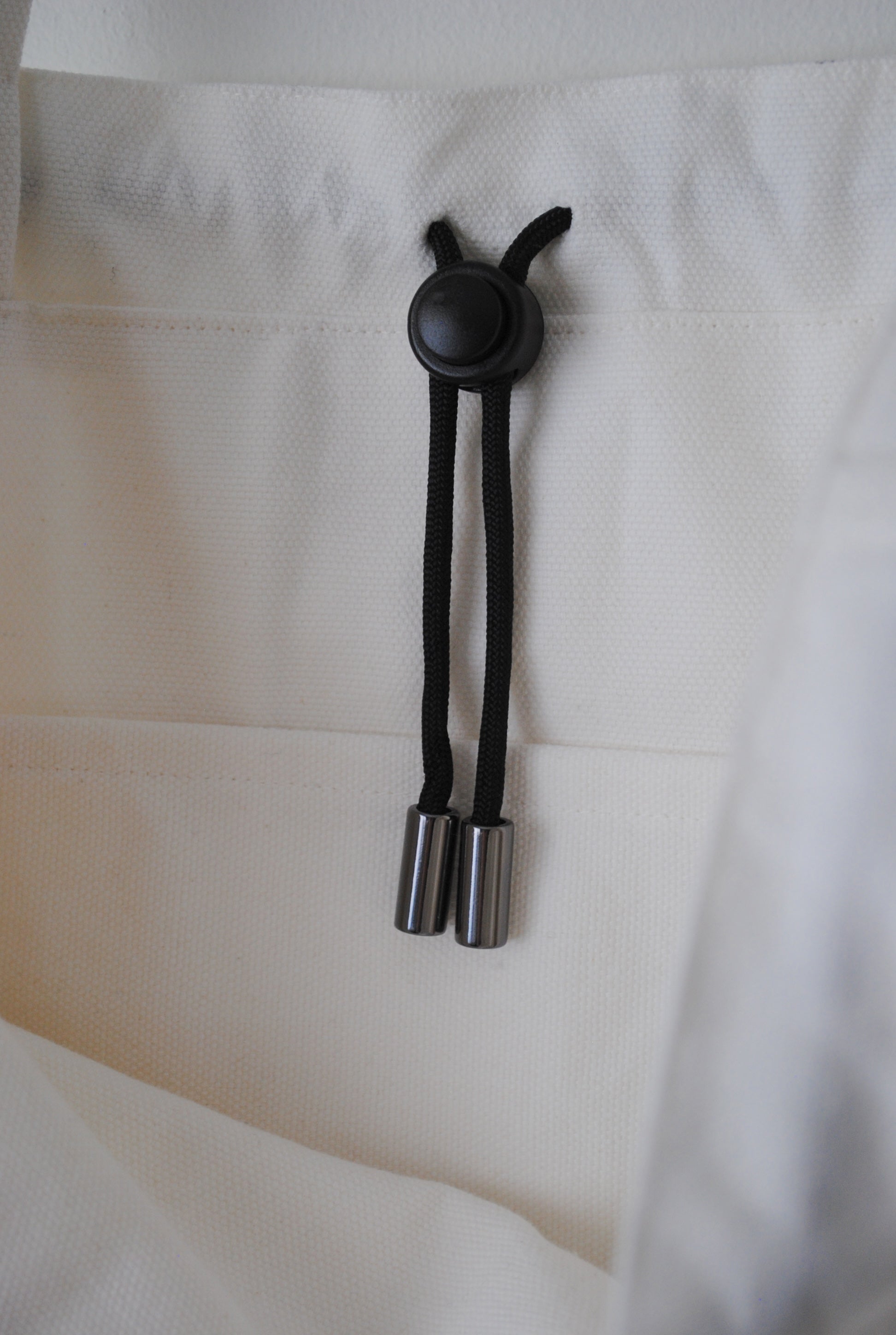 Yta och handtag av slitstark canvas i bomull, klickspännen av plast, snörändar av metall, snöre av paracord.